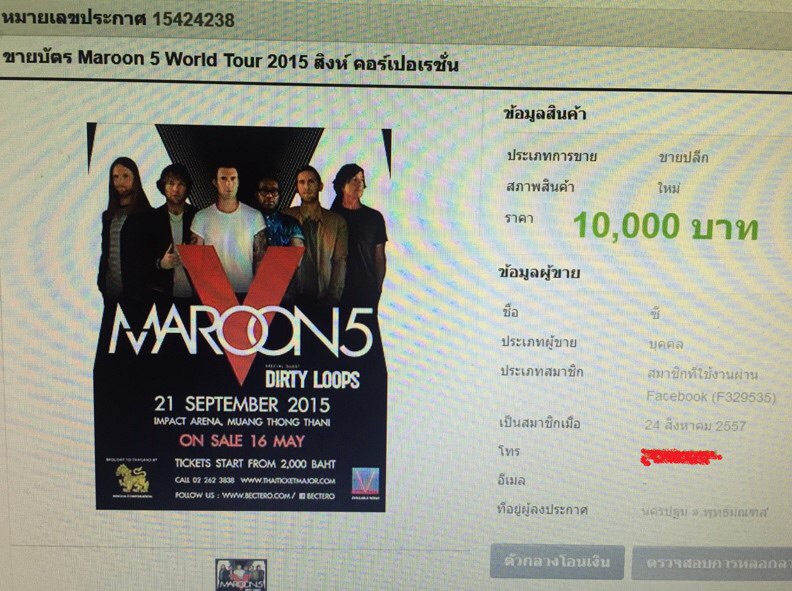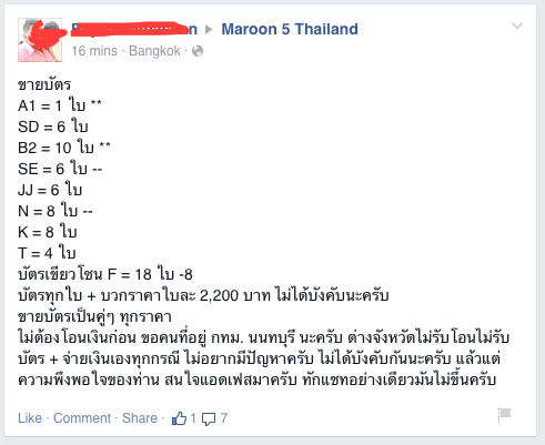 แต่แล้วหลังจากบัตรขายหมดได้ไม่นาน กลับมีผู้นำบัตรคอนเสิร์ตดังกล่าว มาประกาศขายในอินเทอร์เน็ตเป็นจำนวนมาก โดยอัพราคาบัตร ให้เพิ่มเงินตั้งแต่หลักหลายร้อย จนถึงหลายพันบาท บัตรบางใบ ประกาศขายใบละกว่า 1 หมื่นบาท ก็มี !! ซึ่งก็ยิ่งสร้างความไม่พอใจให้เหล่าแฟนคลับ Maroon 5 เป็นอย่างมาก หลายคนได้นำข้อความประกาศขายเหล่านี้มาประจาน พร้อมทั้งรณรงค์ไม่ให้ไปซื้อ เพื่อให้ผู้ที่คิดหากินกับแฟนคลับพวกนี้ ขายบัตรไม่ออก บ้างก็ประกาศเตือนว่าให้ระวังมิจฉาชีพ ที่อาจเอาบัตรผีมาปล่อย หรือโกงเงินค่าบัตร ทำให้ต้องเสียเงินเพิ่ม แล้วยังอดไปดูคอนเสิร์ตด้วย