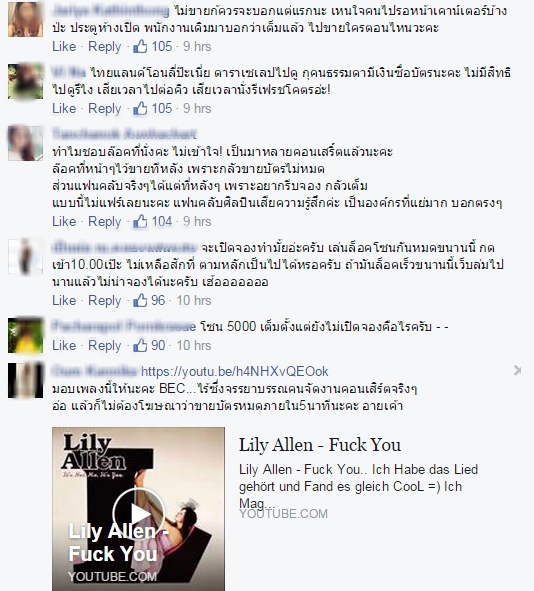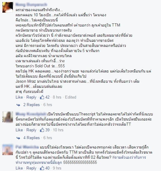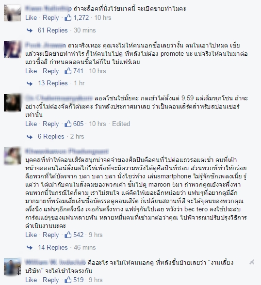 งานนี้ได้มีแฟนคลับเข้าไปคอมเม้นท์ถล่มที่เฟซบุ๊กของผู้จัดงานกันอย่างมากมาย ในขณะที่เว็บไซต์พันทิปดอทคอม ก็ได้มีผู้ตั้งกระทู้ "มาดูความทุเรศของคนขายตั๋วผี คอนเสิร์ต Maroon 5" แชร์เรื่องราวของคนที่ประกาศขายบัตรแบบโก่งราคากันด้วย ซึ่งก็มีชาวเน็ตเข้ามาร่วมวิพากษ์วิจารณ์กันอย่างคับคั่งเลยทีเดียว พร้อมตั้งข้อสังเกตว่า กรณีแบบนี้ เคยเกิดขึ้นเป็นประจำ เวลามีคอนเสิร์ตของศิลปินชื่อดังจากต่างประเทศในไทย