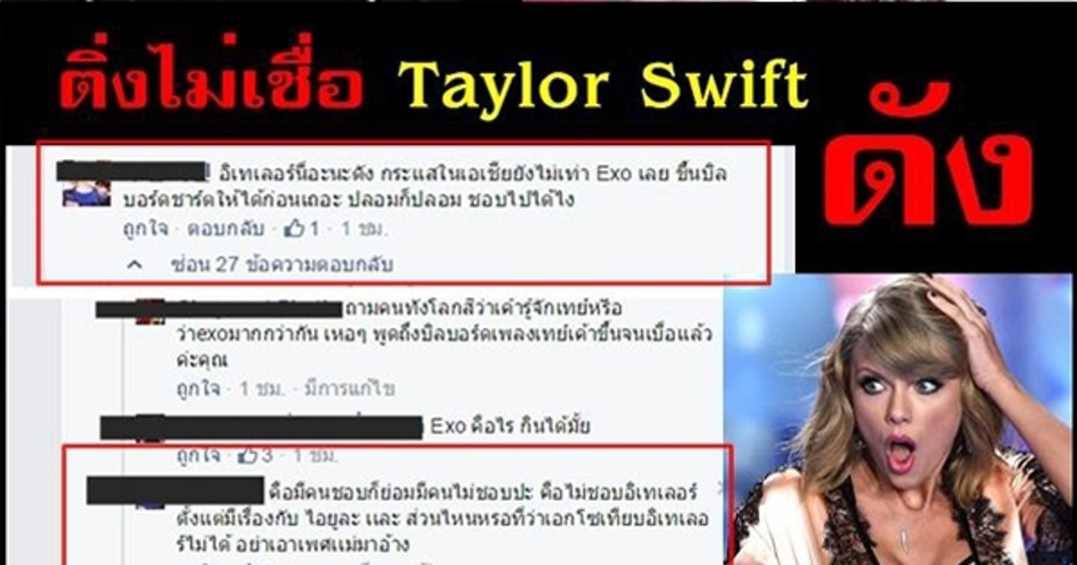 โดยมีข้อความว่า "อิเทย์เลอร์นี่อะนะดัง กระแสในเอเชียยังไม่เท่า EXO เลย ขึ้นบิลบอร์ดชาร์ตให้ได้ก่อนเถอะ ปลอมก็ปลอม ชอบไปได้ไง" ซึ่งแฟนคลับ เทย์เลอร์ สวิฟต์ ได้เข้าไปเถียงว่า "ถามคนทั้งโลกสิว่าเค้ารู้จักเทย์หรือว่า EXO มากกว่ากัน เหอ ๆ พูดถึงบิลบอร์ดเพลงเทย์เลอร์เค้าขึ้นจนเบื่อแล้วค่ะคุณ" ก่อนที่แฟนคลับ EXO จะตอบกลับว่า "คือมีคนชอบก็ย่อมมีคนไม่ชอบปะ คือไม่ชอบอิเทย์เลอร์ ตั้งแต่มีเรื่องกับไอยูละ และส่วนไหนเหรอที่ว่าเอกโซเทียบกับอิเทย์เลอร์ไม่ได้ อย่าเอาเพศแม่มาอ้าง"