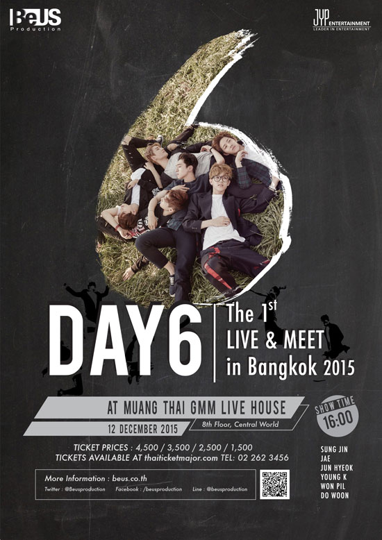 และในเดือนธันวาคมนี้ แฟน ๆ ชาวไทยก็จะได้สัมผัสประสบการณ์สุดพิเศษจาก DAY6 พร้อมการแสดงความสามารถทางดนตรี ที่จะมาสะกดแฟน ๆ ชาวไทยด้วยเสน่ห์อันมากมาย ในงาน DAY6 The 1st Live & Meet in Bangkok 2015 (เดย์ซิก เดอะ เฟิร์ส ไลฟ์ แอนด์ มีท อิน แบงค็อก 2015) วันที่ 12 ธันวาคม 2558 ณ เมืองไทย จีเอ็มเอ็ม ไลฟ์ เฮาส์ เซ็นทรัลเวิลด์ ชั้น 8 บัตรราคา 4,500/3,500/2,500 และ 1,500 บาท งานนี้มีสิทธิพิเศษสำหรับผู้ที่ซื้อบัตรราคา 4500 ทุกใบ จะได้ Hi-Touch อย่างใกล้ชิดกับทั้ง 6 หนุ่ม