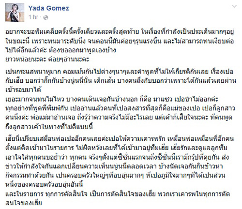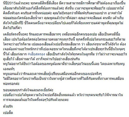 "นี่ปี 2015 แล้วนะคะ ทุกคนมีสิทธิ์มีเสียง มีความสามารถมีการศึกษาที่ไม่ต้องเอาเรื่องขึ้นเตียงมาดันให้ตัวเองได้สิ่งที่ต้องการแล้วค่ะ ดังนั้น เวลาจะพูดจะพิมพ์อะไร เปออยากให้คิดถึงหัวอกคนรับสารนั้นหน่อยค่ะ คุณไม่รู้หรอกว่าที่พิมพ์ ๆ กันคะนองปาก อาจทำให้พ่อแม่ของใครต้องเสียน้ำตา คุณพูดแล้ว 5 นาทีต่อมา คุณอาจจะลืม แต่คนฟังเขาเก็บฝังใจไปอีกกี่ปี ชีวิตคนคนหนึ่งอาจจะเปลี่ยนไปเลยก็ได้เพียงเพราะแค่คำพูดที่คุณพูดไม่คิดไปไม่กี่คำ