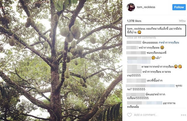 แถมล่าสุด (13 มีนาคม 2560) แฟนคลับตาดี แอบไปเห็นรูปที่หนุ่ม ทอม Room39 เคยโพสต์เอาไว้เมื่อนานมาแล้ว เป็นรูปต้นทุเรียนพร้อมแคปชั่นว่า "ผมเกิดมาเพื่อสิ่งนี้ อยากมีต้นนี้ที่บ้าน"