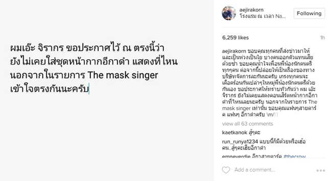 นอกจากนี้ พี่เอ๊ะ จิรากร ยังได้โพสต์ขอบคุณทุกคนที่ส่งข่าวมาให้ พร้อมข้อความเพิ่มเติมว่า "ขอบคุณทุกคนที่ส่งข่าวมาให้ และเป็นห่วงเป็นใย บางคนออกตัวแทนเสียด้วยซ้ำ ขอบคุณน้ำใจเพื่อนพี่น้องนักดนตรีทุก ๆ คน ต่อจากนี้ปล่อยให้เป็นเรื่องของทางบริษัทจัดการละกันนะครับ เกรงทุกคนจะเดือดร้อนกันเปล่า ๆ ในหมู่พี่น้องนักดนตรีด้วยกันเอง ขอประกาศให้ทราบทั่วกันว่า ผม เอ๊ะ จิรากร ยังไม่เคยแสดงคอนเสิร์ตหน้ากากอีกาดำที่ไหนเลยนะครับ นอกจากในรายการ The mask singer เท่านั้น ขอบคุณแฟน ๆ สายดาร์ก แฟน ๆ อีกาดำครับ \\m/"