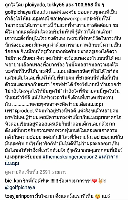 โดยล่าสุด (11 พฤษภาคม 2560) หลังถอดหน้ากากแมงมุม เรียบร้อยแล้ว กอล์ฟ พิชญะ ก็ได้โพสต์ข้อความเปิดใจผ่าน IG ดังนี้...