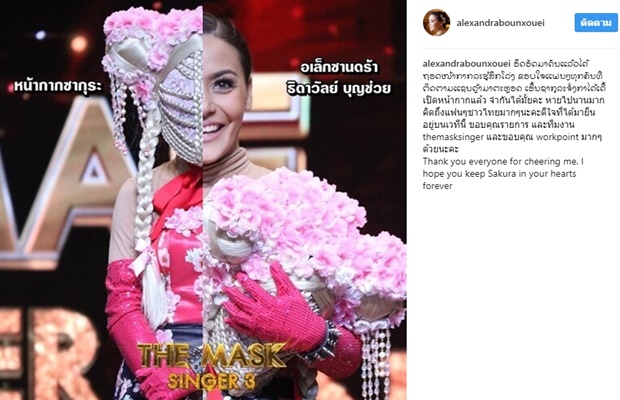 โดยหลังเปิดหน้ากากสาวอเล็กซานดร้า ได้โพสต์เปิดใจแบบ 3 ภาษา ทั้งลาว, ไทย และอังกฤษ ว่า "เปิดหน้ากากแล้ว จำกันได้มั้ยคะ หายไปนานมาก คิดถึงแฟน ๆ ชาวไทยมาก ๆ นะคะ ดีใจที่ได้มายืนอยู่บนเวทีนี้ ขอบคุณรายการ และทีมงาน The Mask Singer และขอบคุณ Workpoint มาก ๆ ด้วยนะคะ"