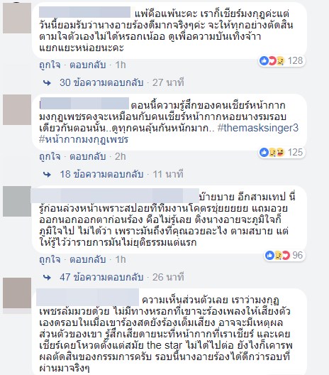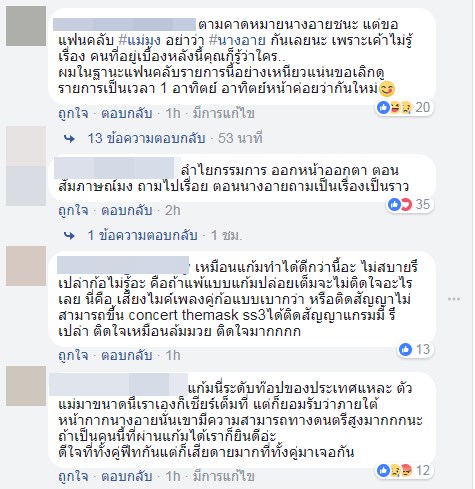 ขณะเดียวกันก็มีผู้ชมอีกจำนวนมากที่มองว่า การแข่งขันในรอบนี้ ทั้ง 2 หน้ากาก ต่างก็ทำผลงานออกมาได้อย่างดีเยี่ยมทั้งคู่ ไม่ว่าใครจะชนะก็ไม่แปลก หรือใครจะเป็นฝ่ายตกรอบก็น่าเสียดายทั้งนั้น แต่การที่ หน้ากากนางอาย เป็นผู้ชนะ ก็ไม่ถือว่าค้านสายตาอะไร กองเชียร์ควรจะยอมรับในผลการตัดสินในครั้งนี้ และเอาใจช่วยผู้เข้าแข่งขันที่ชื่นชอบกันต่อไป