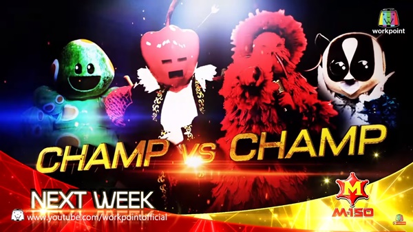 ใกล้เข้าสู่ความเข้มข้นถึงขีดสุดแล้ว สำหรับการแข่งขันในรายการ The Mask Singer หน้ากากนักร้อง ซีซั่น 3 ที่ในสัปดาห์หน้าจะเป็นรอบ แชมป์ชนแชมป์ (CHAMP VS CHAMP) สงครามแห่งพลังเสียงระหว่าง 4 หน้ากาก ได้แก่ หน้ากากแอปเปิ้ล (แชมป์กรุ๊ป A) หน้ากากหนอนชาเขียว (แชมป์กรุ๊ป B) หน้ากากนางอาย (แชมป์กรุ๊ป C) และ หน้ากากอีกาแดง (แชมป์กรุ๊ป D)