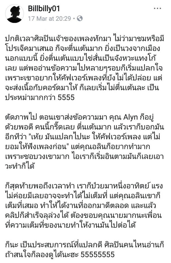 บิลบิลลี่ย์ ศิลปินและยูทูบเบอร์หนุ่มชาวไทย ผู้มากความสามารถ และร้องคัฟเวอร์เพลงสากลมาแล้วมากมาย ได้โพสต์เล่าเรื่องราวสุดประทับใจ เมื่อวง
