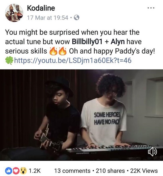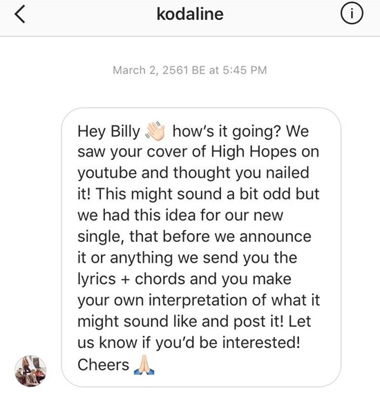 ยูทูบเบอร์หนุ่มไทย Billbilly01 สุดปลื้ม วง Kodaline ติดต่อมาขอให้ร้องเพลงคัฟเวอร์เพลงใหม่ของวง ที่ยังไม่เคยปล่อยที่ไหน เจ้าตัวเผย ประหม่ามาก แต่ก็เป็นประสบการณ์ที่น่าตื่นเต้นสุด ๆ เมื่อวันที่ 17 มีนาคม 2561
