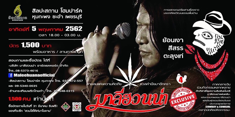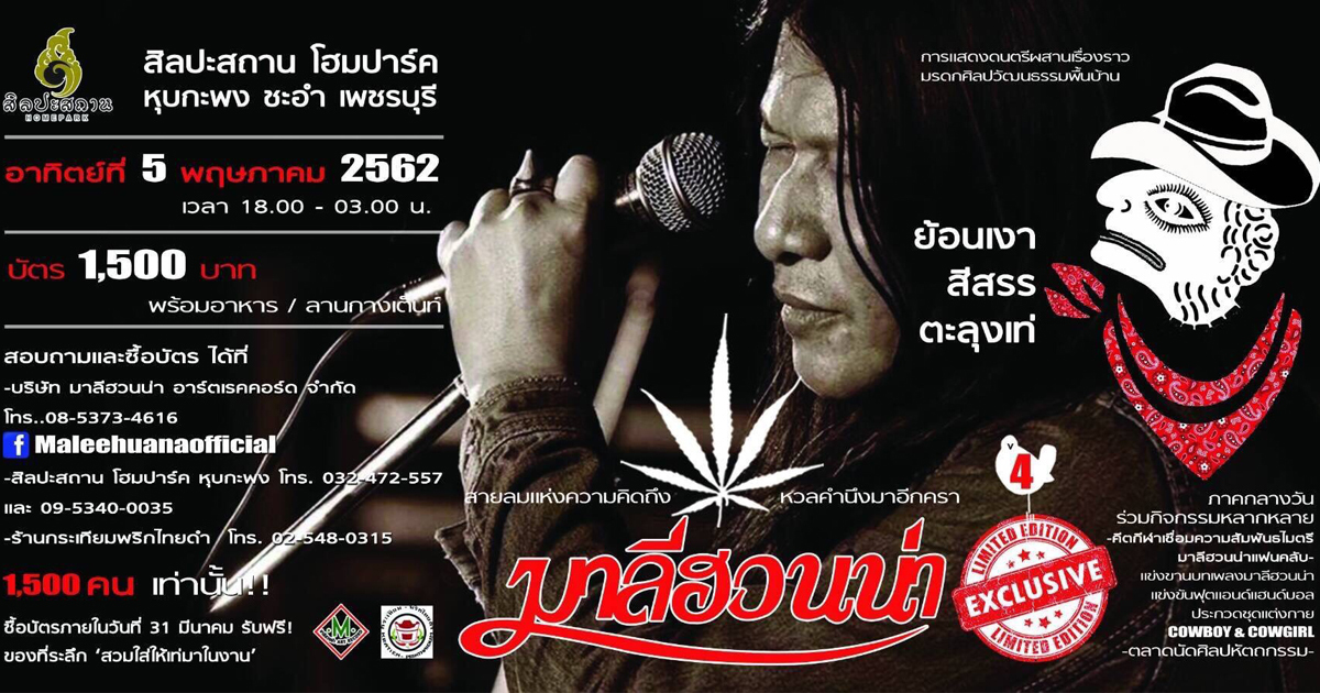 สายลมแห่งความคิดถึงหวนคำนึงมาอีกครา คฑาวุธ ทองไทย หรือ อ.ไข่ มาลีฮวนน่า จัดเต็มการแสดงดนตรีเรื่องราวมรดกพื้นบ้าน คอนเสิร์ต มาลีฮวนน่า เอ็กซ์คูลซีฟ 4 ย้อนเงาสีสรรตะลุงเท่ ที่ สิลปะสถาน โฮมปาร์ค หุบกะพง อ.ชะอำ จ.เพชรบุรี วันอาทิตย์ที่ 5 พฤษภาคม 2562 บัตรราคา 1,500 บาท พร้อมอาหาร และลานกางเต็นท์ รับจำนวนจำกัดแค่ 1,500 คน เท่านั้น