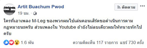 ล่าสุด (26 กันยายน 2562) ไมค์ หรือ DM (Dynamite) แรปเปอร์หนุ่มจากวง Thaiblood ได้โพสต์ข้อความลงบนเฟซบุ๊กส่วนตัว ระบุว่า "ใครที่เอาเพลง M-Leg ของพวกผมไปเล่นคอนเสิร์ต ขอดำเนินการตามกฎหมายนะครับ ส่วนเพลงใน YouTube ถ้ายังไม่ลบเดี๋ยวผมให้ทนายทักไปครับ"