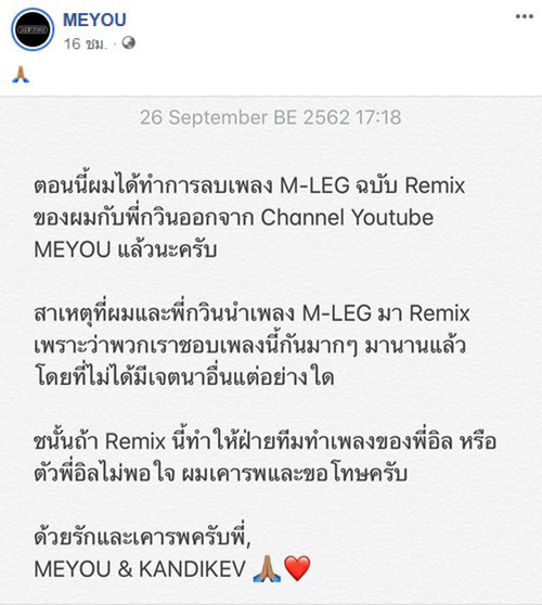 หลังจากนั้น นักร้องหนุ่ม MEYOU ก็ได้โพสต์เฟซบุ๊กชี้แจงและขอโทษ ระบุว่า ตอนนี้ตนได้ทำการลบเพลง M-Leg ฉบับรีมิกซ์ของตนที่ทำร่วมกับ กวิน อินทวงษ์ โปรดิวเซอร์คู่ใจ ออกจากช่องยูทูบเรียบร้อยแล้ว