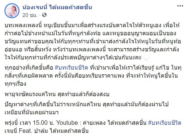 แม้ว่าจะเจอกระแสดราม่าถล่มหนักหน่วงก่อนหน้านี้ แต่นักร้องสาว เจนนี่ ได้หมดถ้าสดชื่น ก็ยังคงเดินหน้าแชร์ผลงานของตัวเองอย่างต่อเนื่อง และล่าสุด เจ้าตัวก็ได้ประกาศปล่อยผลงานเพลงใหม่ ชื่อเพลง "บทเรียนชีวิต" พร้อมเผยว่า