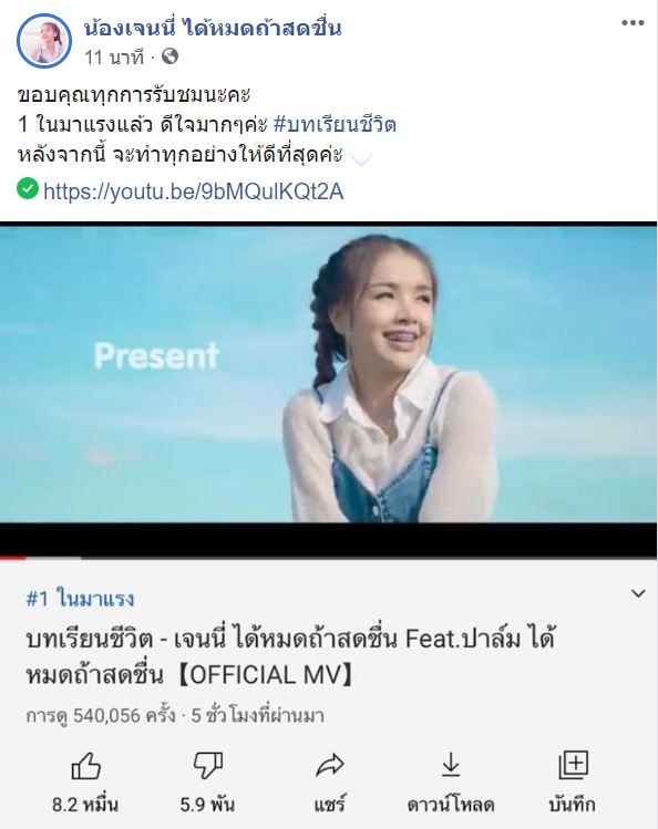 โดยหลังจากที่ เจนนี่ ได้หมดถ้าสดชื่น ปล่อยเพลง บทเรียนชีวิต ได้ไม่นาน ก็ขึ้นเป็นหนึ่งในเพลงมาแรง ทาง YouTube เป็นที่เรียบร้อยแล้ว ด้วยยอดวิวกว่า 5 แสนวิว ในเวลาเพียง 5 ชั่วโมงเท่านั้น