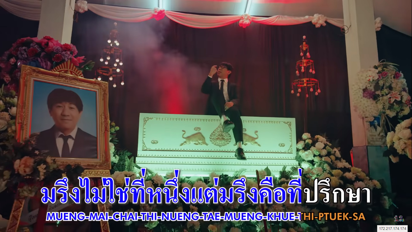 - เปิดตัว MV ด้วยบรรยากาศในงานศพ รูปถ่ายหน้างานศพคือ โน้ต อุดม มองผ่าน ๆ เหมือนจะไม่มีอะไร แต่บอกเลยว่าเล่นตั้งแต่เปิดฉากกันเลย เพราะลายโลงศพที่คนคุ้นตา มีกระทิงสีทองหันเข้าหากัน