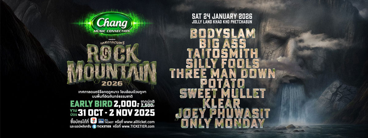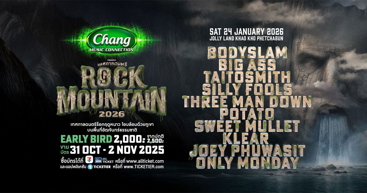 มาร่วมเป็นส่วนหนึ่งของตำนานบทใหม่ ที่กำลังจะถูกจารึก พร้อมออกเดินทางบนเกาะลับแห่งยักษ์ไปด้วยกัน ในงาน Chang Music Connection presents Rock Mountain 2026 ซึ่งจะจัดขึ้นในวันเสาร์ที่ 24 มกราคม 2569 ณ Jolly Land เขาค้อ จังหวัดเพชรบูรณ์ เริ่มจำหน่ายบัตร Early bird ราคา 2,000 บาท จากปกติ 2,500 บาท จำหน่ายบัตรวันที่ 31 ตุลาคม - 2 พฤศจิกายน 2569 ที่ Counter Service All Ticket ในร้าน 7-Eleven ทุกสาขาทั่วประเทศ www.allticket.com และแอปพลิเคชัน Ticketier หรือ ticketier.events ติดตามรายละเอียดเพิ่มเติมได้ที่ Facebook, IG, TIKTOK : GFESTTH