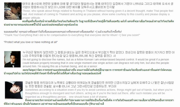 "ต้องขออภัยจริง ๆ ครับที่ทำให้เกิดกระแสวิพากษ์วิจารณ์มากมาย พวกเราเองก็คิดว่าคงไม่มีข้ออ้างอะไรที่จะมาลบล้างความผิดได้ เรารู้สึกอับอายกับการไม่ได้เอาใจใส่ไปถึงความรู้สึกของผู้ประสบภัย ซึ่งเราก็จะลงโทษตัวเอง และแก้ไขสิ่งผิดพลาด ซึ่งเรียกได้ว่าเป็นสิ่งที่ทำลายภาพพจน์ของประเทศด้วย ตั้งแต่นี้ไปเราจะปฏิบัติตัว ด้วยความรับผิดชอบในฐานะเป็นตัวแทนของดารานักแสดงชาวเกาหลี และจะแสดงความเป็นผู้ใหญ่ให้มากกว่านี้ครับ"